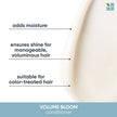 Appliquer sur les cheveux mouillés et laisser agir de 1 à 3 minutes. Rincer abondamment. Nous vous recommandons d'associer l'après-shampoing Volume Bloom au shampoing Volume Bloom pour obtenir un volume léger et de la brillance.