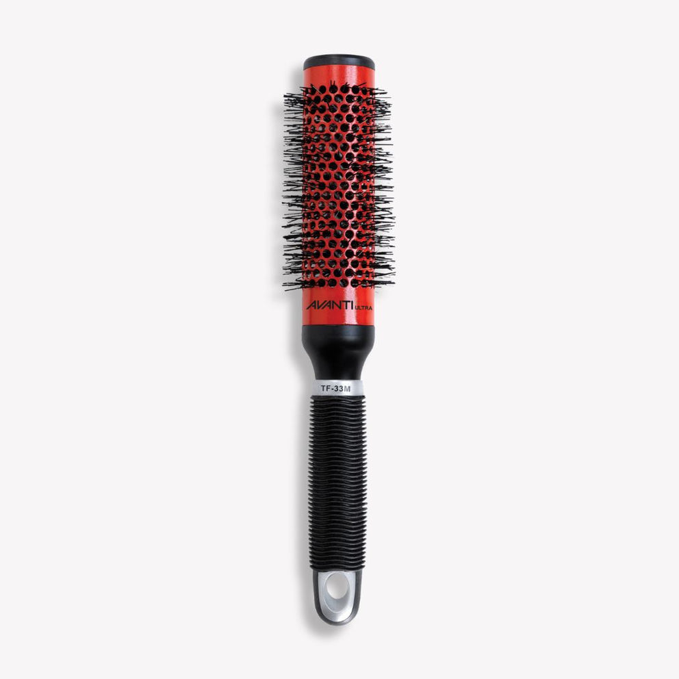Moyenne brosse thermique avec tourmaline et céramique Brosse thermique circulaire- tube de 33mm Poils de nylon fermes et contenant de la tourmaline Tube en céramique dotés de larges orifices Manche noir caoutchouté de forme ergonomique Légère et équilibrée Offerte en 3 autres formats : PETIT ( TF-25SC ), GRAND ( TF-43LC ) et GéANT ( TF-53XLC ) La céramique et la tourmaline, des sources naturelles d'ions négatifs et de chaleur infrarouge lointain, empêchent la formation de charges électrostatiques et éliminent la frisure indésirable, laissant ainsi les cheveux lustrés et sains Le tube en céramique distribue et conserve efficacement la chaleur procurant ainsi un coiffage plus rapide. La chaleur infrarouge, qui est produite pendant le séchage, est douce pour les cheveux Légère et de forme ergonomique, elle est parfaite pour l'utilisation prolongée Les orifices du tube permettent la circulation de l'air, ce qui rend le séchage plus efficace Les poils en nylon assurent une bonne tension sur les cheveux, permettant de maîtriser les chevelures les plus denses et les plus désordonnées Le manche caoutchouté très confortable procure une maîtrise totale, une prise solide et un confort inégalé pendant le coiffage
