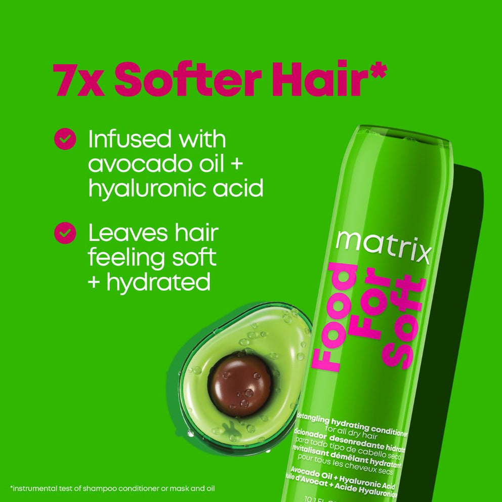 Ce duo hydratant est infusé d'huile d'avocat et d'acide hyaluronique. Il hydrate tout en nettoyant et en éliminant l'excès de sébum sans priver les cheveux secs de l'hydratation nécessaire. L'ensemble contient: 1 x shampoing Food for Soft 300 ml 1 x revitalisant Food for Soft 300 ml