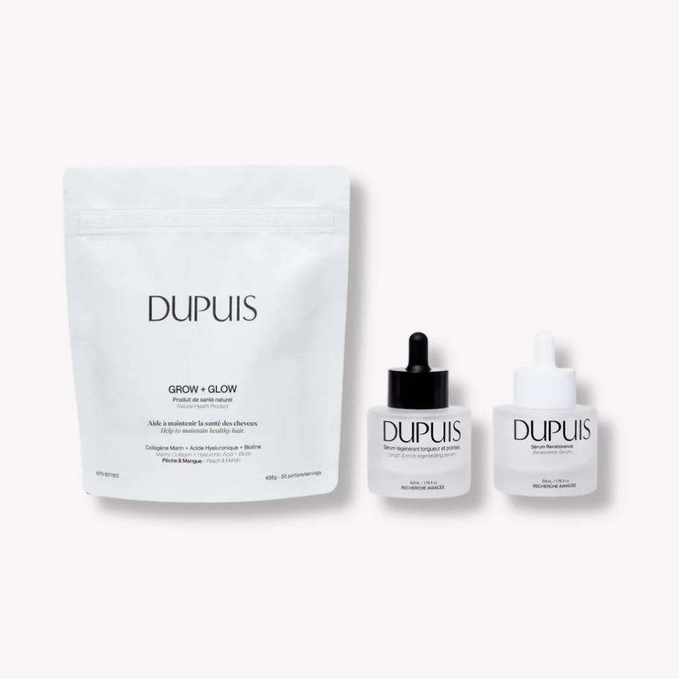 Un trio puissant conçu pour fortifier la fibre capillaire, nourrir le cuir chevelu et améliorer visiblement la densité des cheveux. Ce coffret réunit le Supplément GROW & GLOW, le Sérum Renaissance et le Sérum Régénérant Longueurs & Pointes, pour une routine complète qui agit de l’intérieur comme de l’extérieur. Résultat : une chevelure plus résistante, hydratée et éclatante de santé.