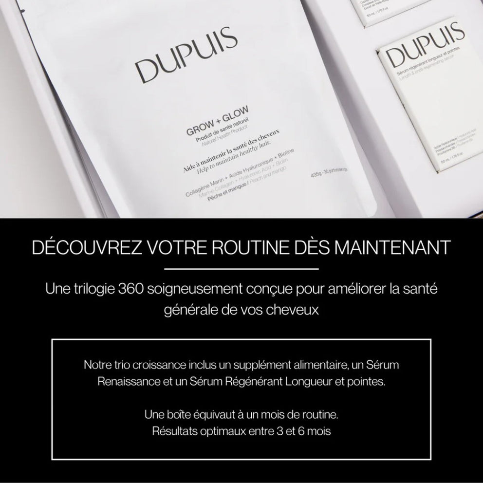 Supplément alimentaire Grow + Glow : Mélanger 1 cuillère par jour dans de l’eau ou dans votre boisson préférée et remuer jusqu’à dissolution complète. Sérum Renaissance pour cuir chevelu : Appliquer 1 fois par jour sur cuir chevelu sec ou légèrement humide. Masser doucement 1 à 2 minutes, sans rincer. Sérum régénérant longueur & pointes : Appliquer 1 à 2 pipettes par jour sur les longueurs et pointes, cheveux secs ou humides. Ne pas rincer. Rythme recommandé : Utiliser les soins au moins 5 jours sur 7 pour des résultats visibles. Les premiers signes positifs apparaissent dès 30 jours, avec des résultats significatifs après 3 mois de régularité.