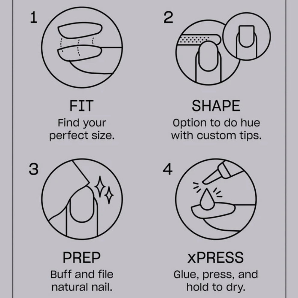 Étape 1 : Couvrez votre ongle naturel avec chaque prothèse d'ongles pour trouver la taille parfaite, en vous assurant d'aligner le numéro avec le bout de votre ongle naturel. Étape 2 : Réalisez des formes et des longueurs personnalisées en utilisant le côté Shape Up de votre lime. Étape 3 : Coupez ou limez vos ongles si nécessaire et polissez légèrement leurs surfaces. Retirez la poussière et les débris à l'aide du tampon Prep to xPRESS puis repoussez délicatement les cuticules. Étape 4 : Retirez le capuchon de la colle et pressez doucement le flacon. Pour une tenue plus longue, appliquez la colle au dos de l'ongle à presser et sur l'ongle naturel. Pour une utilisation à court terme, appliquez la colle uniquement sur l'ongle à presser. Pour les retirer : Trempez vos ongles dans de l'eau chaude pendant 10 minutes et appliquez une petite quantité d'acétone sur la base de l'ongle à l'aide d'un coton-tige. Ensuite, soulevez délicatement les prothèses d'ongles à l'aide de votre bâton à cuticules.