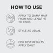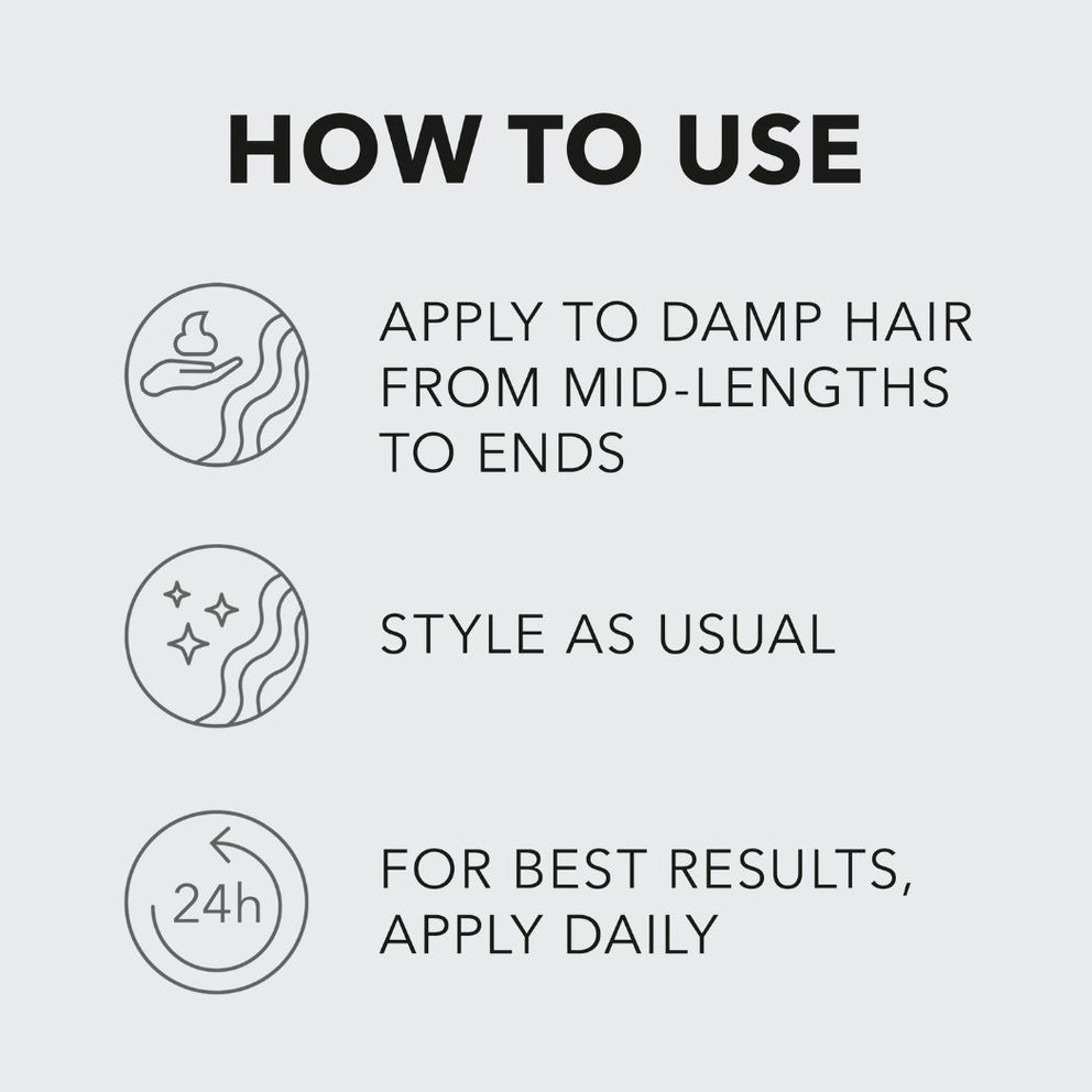 Appliquer sur les cheveux humides de la mi-longueur aux pointes. Coiffer comme d'habitude. Pour de meilleurs résultats, appliquer quotidiennement.