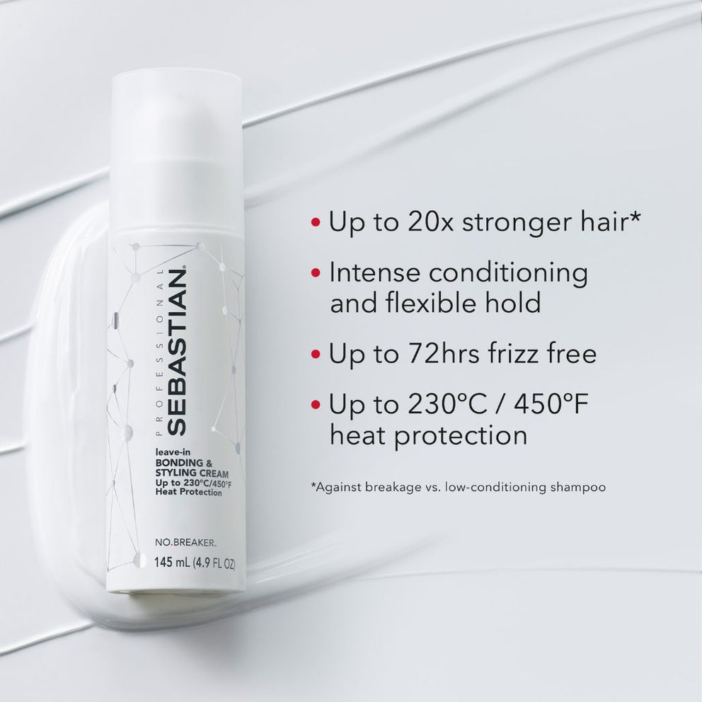 La crème sans-rinçage Bonding & Styling de Sebastian crée des liens et assure une tenue souple tout en conditionnant intensément vos cheveux. Elle offre des coiffures sans frisottis et protège contre la chaleur jusqu'à 230ºC (450ºF). Les cheveux deviennent jusqu'à 20 fois plus forts grâce à une protection contre la casse par rapport à un shampoing peu revitalisant. Avec un conditionnement intense et une fixation souple, cette crème offre jusqu'à 72 heures de protection contre les frisottis, garantissant des cheveux lisses et brillants.