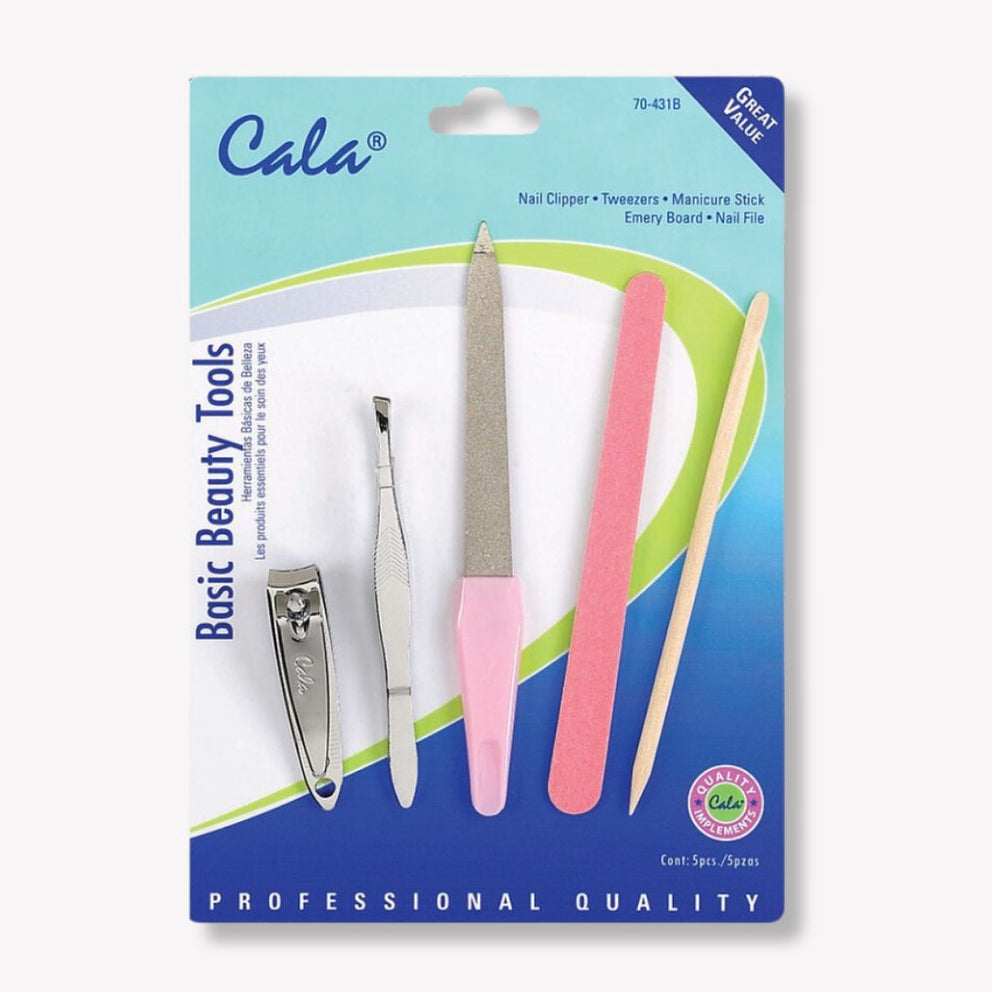Cet ensemble inclut un coupe-ongle, une pince à épiler, un bâton pour manucure, une lime à émeri et une lime à ongles.
