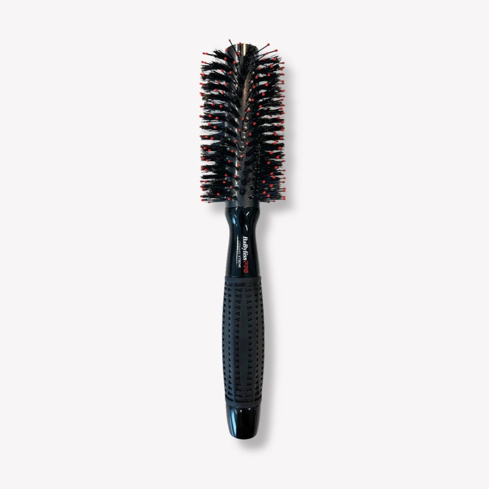 This professional round brush combines ceramic heat distribution with spiral bristle technology to speed up drying while enhancing shine and smoothness. Its blend of ion-infused nylon bristles and natural boar bristles lifts roots, detangles, and adds volume, while the ceramic-coated barrel and ergonomic wood handle with rubber grip ensure effortless styling and control.
