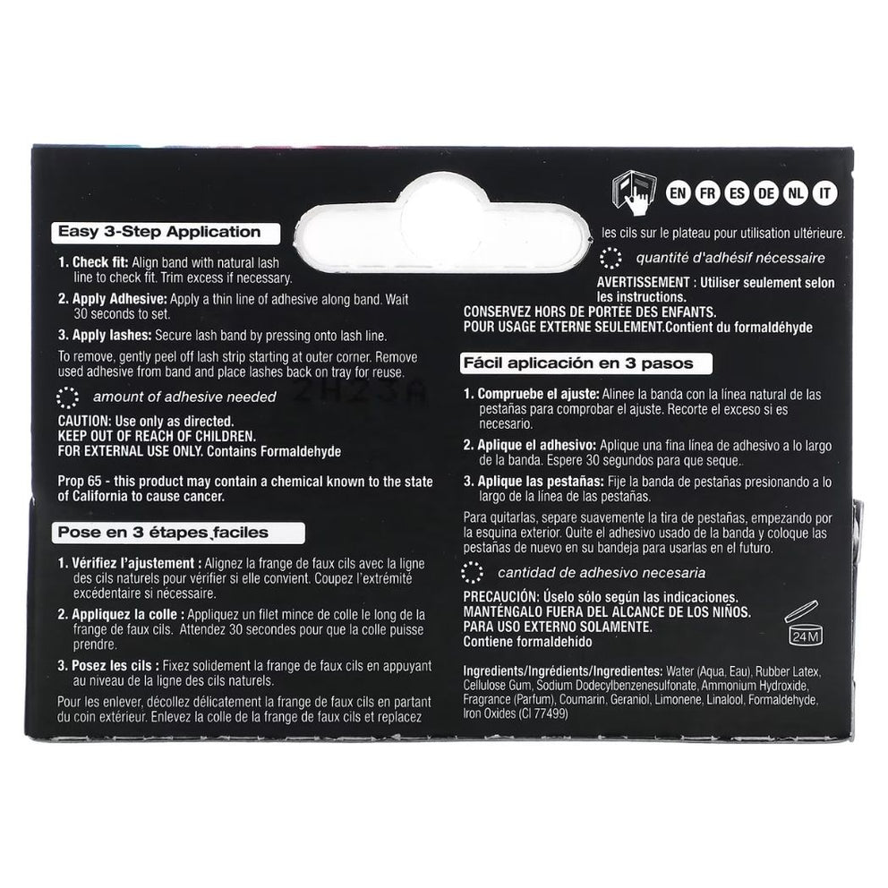 STEP 1: Align band with natural lash line. Trim excess if necessary._ STEP 2: Apply a thin line of adhesive along the lash band. Wait 30 seconds for adhesive to become tacky and set._ STEP 3: Apply the lash by securing the band and gently pressing down._