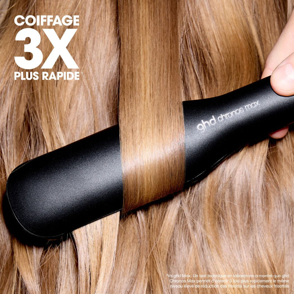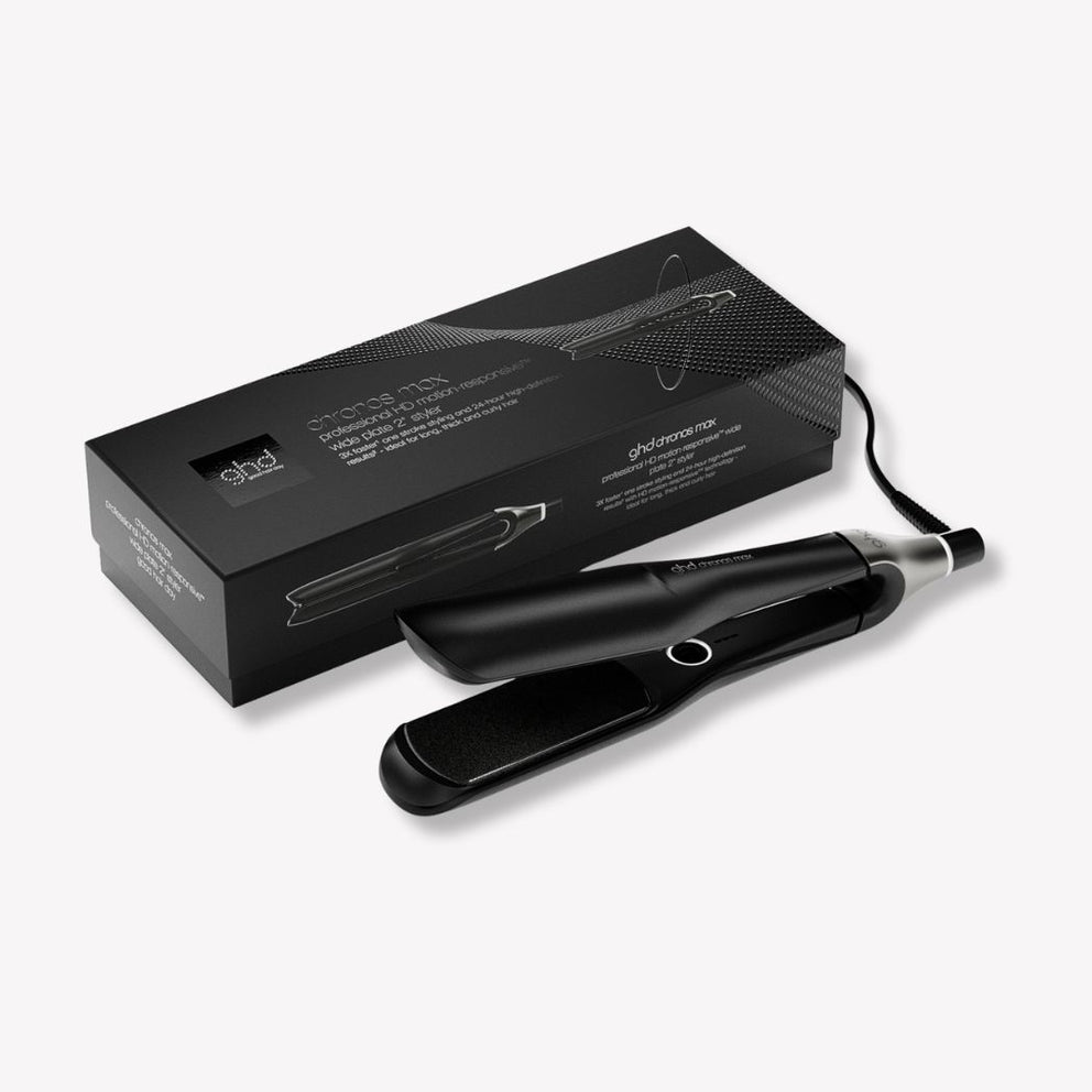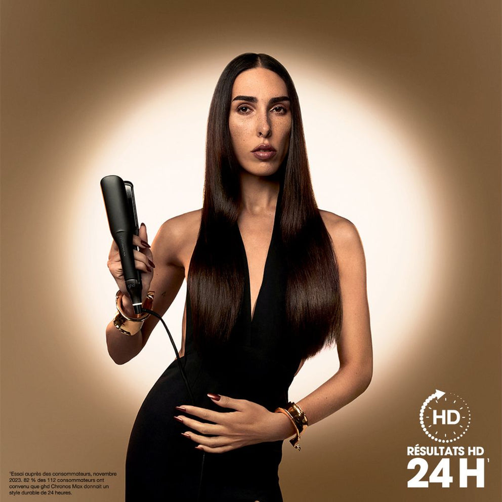 Equipped with advanced motion-responsive HD technology and featuring 85% wider, close-edged plates, GHD Chronos Max guarantees up to 3 times faster styling in a single pass, with HD results that last for 24 hours. This styler works quickly on large sections of hair, delivering up to 3 times smoother finish and 90% more shine. Thanks to its innovative plates, it also ensures optimum access to the roots for impeccable results from root to tip. Ideal for long, thick and curly hair. Optimum temperature up to 365°F (185°C) and universal tension. 2-year warranty.