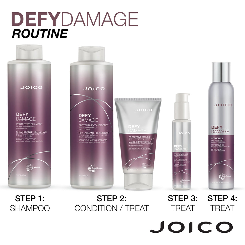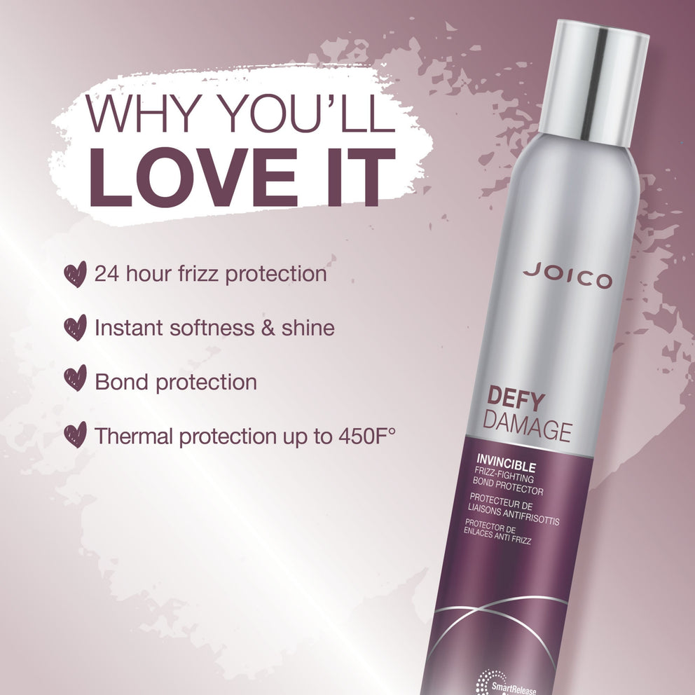 Defy Damage Invincible Treatment revitalizing spray protects hair with an invisible barrier against frizz, heat up to 450°F and pollution, while nourishing it. This lightweight mist provides 24-hour frizz control, instant softness, silky shine and optimal heat protection.
