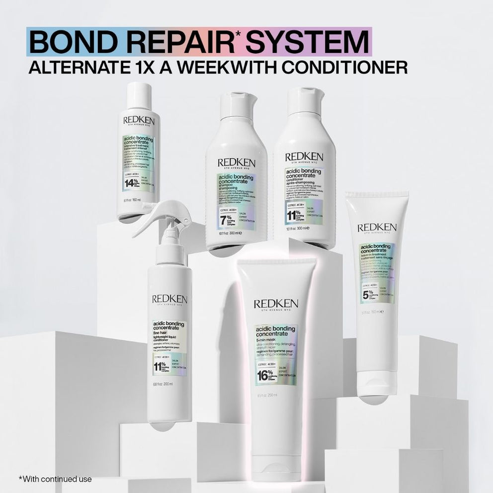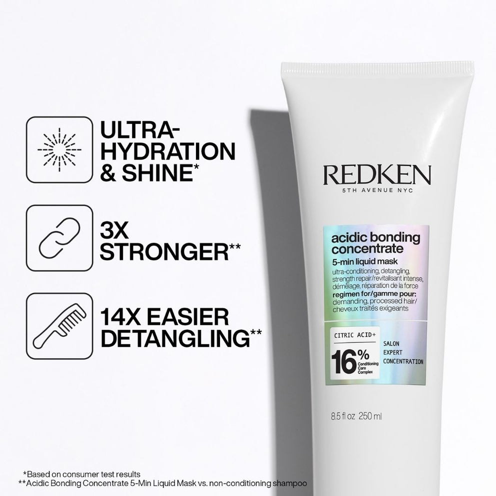 Redken's Acidic Bonding Concentrate 5-Minute Liquid Hair Mask intensely hydrates and repairs all hair types in just 5 minutes. Formulated with a 16% conditioning complex combining cationic agents and nourishing oils, it coats the hair fiber, makes it easier to detangle, strengthens the hair, and gives it lasting shine without weighing it down. The result: hair that is 3 times stronger, ultra-hydrated for 72 hours, shiny for 3 days, and 14 times easier to detangle.