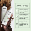Apply shampoo to scalp and gently massage evenly. Rinse thoroughly. Rub conditioner from roots to ends. Leave in for 1-3 minutes. Rinse thoroughly. Apply the serum on the roots. Do not rinse.