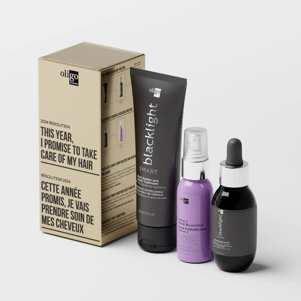 Kit includes: 1 Blacklight Smart bond repair and strengthening treatment 5 oz 1 Hair & Scalp Treatment Oil 2.7 oz 1 Blacklight 18 in 1 Hair Beautifier 2 oz