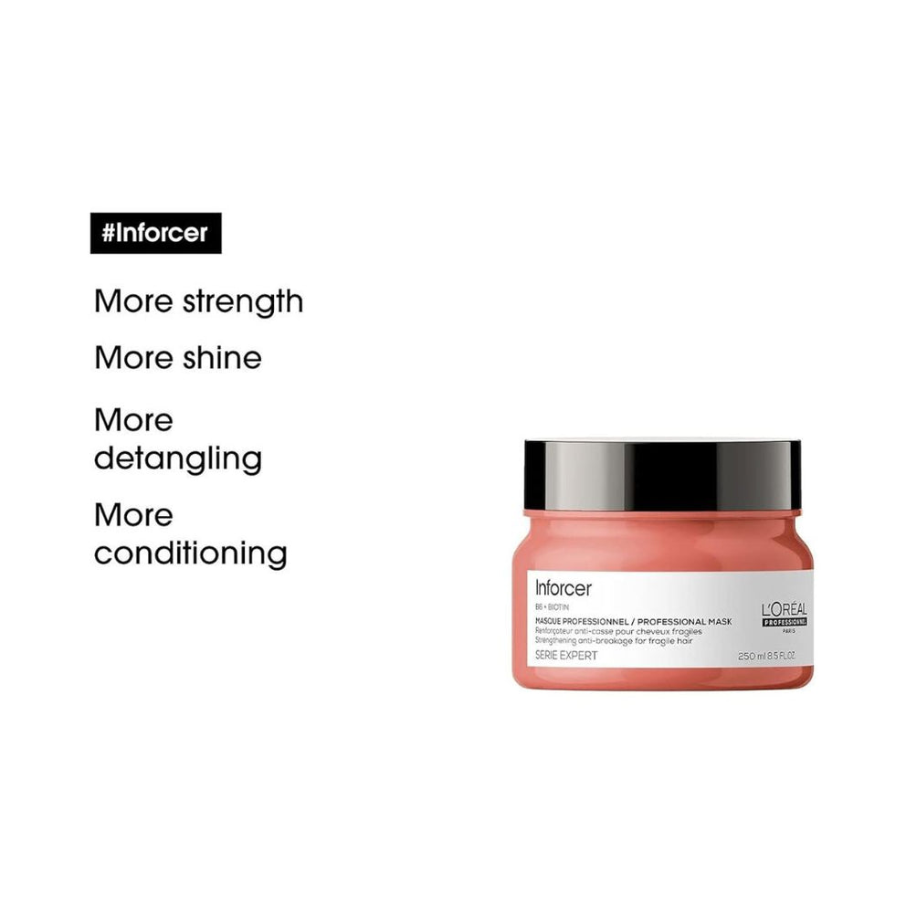 L'Oréal's Inforcer mask for fragile, brittle hair provides extra strength, care and shine, and makes hair easier to detangle. With continued use, the Inforcer mask will help your hair become stronger and more resistant to breakage. It is recommended for fragile, easily breakable hair, especially long hair.