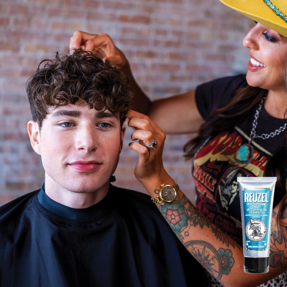 Begin with a small amount of Matte Styling Paste, emulsify between the palms and apply to blow-dried or thoroughly towel dried hair. Add more as needed for longer, thicker hair. Once Matte Styling Paste is dry, brush through to activate matte finish and style as desired.