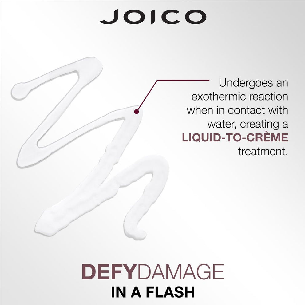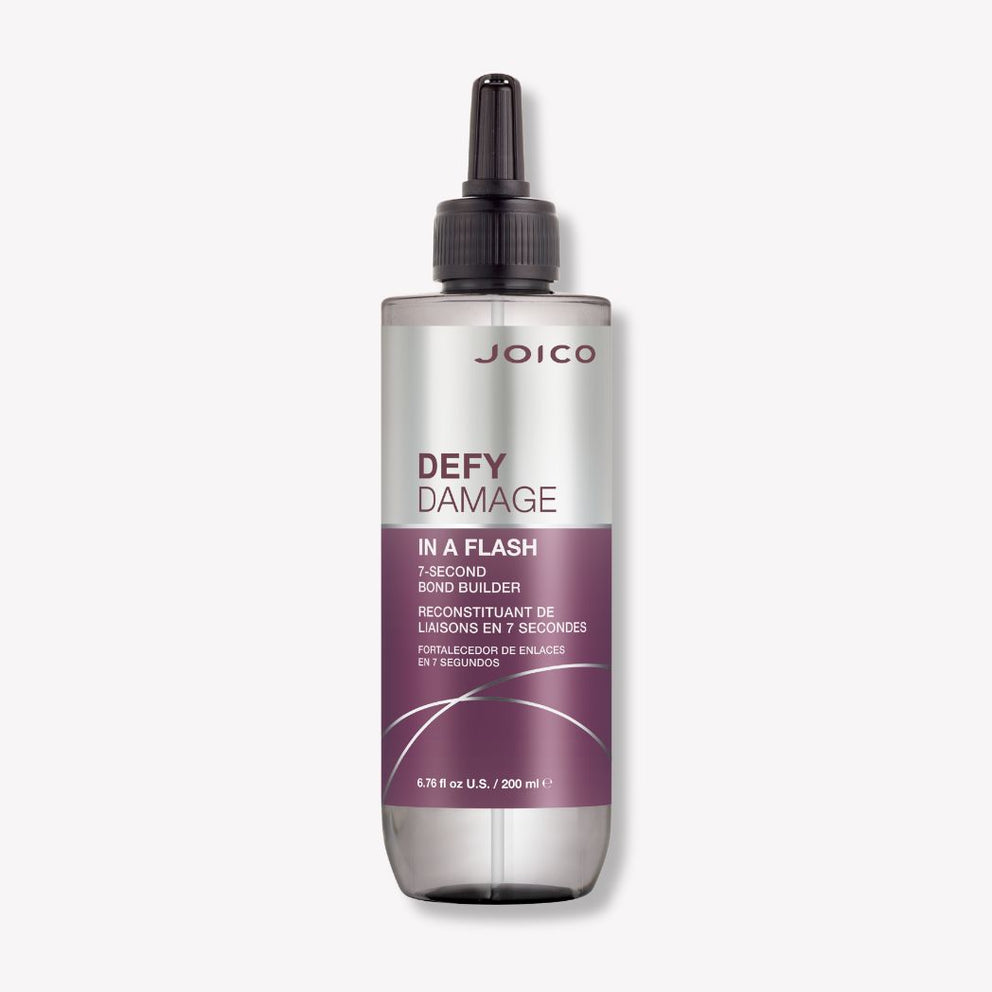 Joico's 7-second Defy Damage In a Flash is a unique liquid-cream treatment that instantly helps strengthen hair structure and create bonds. The product undergoes an exothermic reaction on contact with water, giving it the consistency of a liquid cream that helps boost hair strength 20-fold. Defy Damage In a Flash 7-second bonding agent is formulated to protect hair strands from the daily effects of heat styling, UV exposure and environmental pollution, which result in dry, dull, lackluster strands. This treatment is lightweight, so it never weighs hair down, and it's ideal for all hair types and textures that need to be intensely strengthened and nourished.