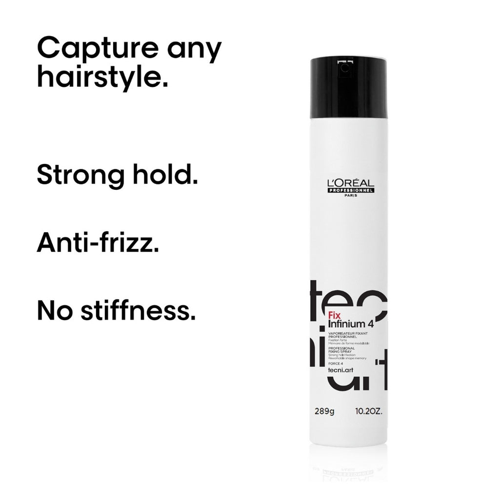 La laque Tecni.Art Fix Infinium 4 de L'Oréal Professionnel offre une tenue forte et longue durée, tout en garantissant un contrôle souple et une mémoire de forme. Son microdiffuseur ultrafin assure une couverture uniforme, laissant les cheveux lisses, brillants et sans frisottis, avec un toucher naturel. Idéale pour fixer les coiffures complexes ou maintenir des looks soignés et volumineux.