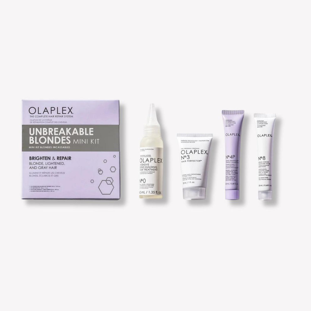 The Olaplex Unbreakable Blonde Set is the ultimate starter ritual for fragile blonde hair, whether lightened, bleached, highlighted, naturally white or grey. This collection introduces the restorative power of Olaplex’s patented bond-building technology through four targeted treatments that repair, protect, tone, and deeply hydrate delicate hair fibers. Designed to address breakage, dryness, brassiness, and lack of shine, this kit delivers salon-grade results while enhancing strength and radiance from root to tip. This kit includes : 1 N.0 Intensive Bond Building Treatment - 40 ml 1 N.3 Hair Perfector - 30 ml 1 N.4P Blonde Enhancer Toning Shampoo - 20 ml 1 N.8 Bond Intense Moisture Mask - 20 ml