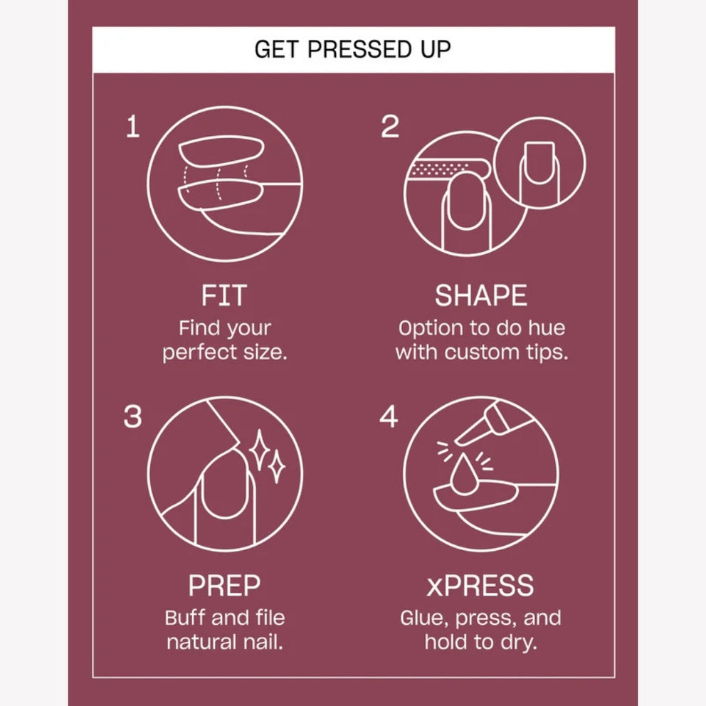 Step 1: Cover your natural nail with each nail prosthesis to find the perfect size, making sure to align the number with the tip of your natural nail. Step 2: Create customized shapes and lengths using the Shape Up side of your file. Step 3: Trim or file your nails if necessary and lightly polish their surfaces. Remove dust and debris with the Prep to xPRESS pad, then gently push back cuticles. Step 4: Remove the glue cap and gently squeeze the bottle. For longer-lasting hold, apply the glue to the back of the nail to be pressed and to the natural nail. For short-term use, apply glue only to the nail to be pressed. To remove: Soak your nails in warm water for 10 minutes and apply a small amount of acetone to the base of the nail using a cotton swab. Then gently lift the nail extensions with your cuticle stick.
