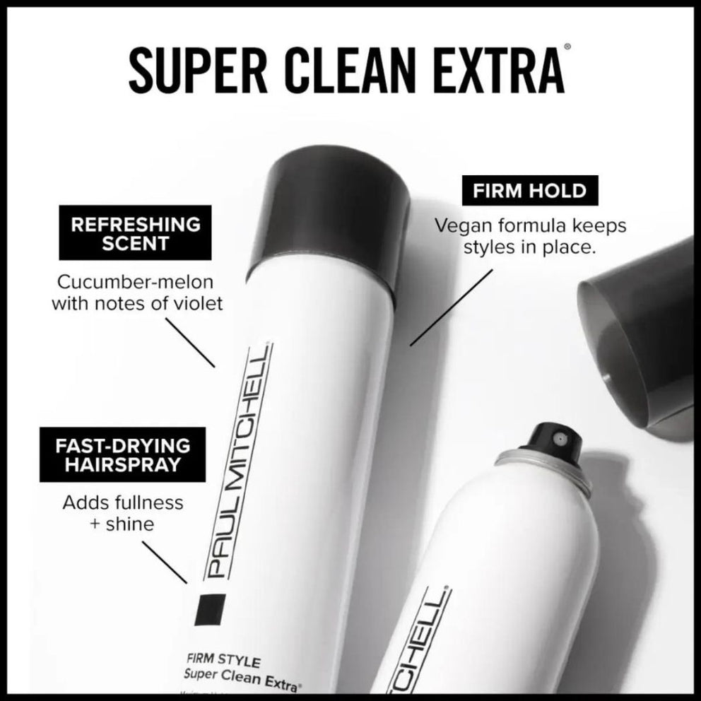 Create long-lasting styles with Fast-Drying Super Clean Extra Finishing Spray. This lightweight spray provides powerful hold that lasts all day without weighing hair down. Conditioning ingredients add fullness and shine to your hair. WHAT IT DOES Provides firm hold, strengthens body and adds shine. HOW IT WORKS The Firm styling elements and conditioning ingredients add volume and shine. BONUS Dries quickly for quick and easy styling. FEATURES • UV protection • Paraben-free • Vegan • Safe for colored hair