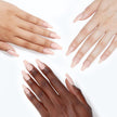 Step 1: Cover your natural nail with each nail prosthesis to find the perfect size, making sure to align the number with the tip of your natural nail. Step 2: Create customized shapes and lengths using the Shape Up side of your file. Step 3: Trim or file your nails if necessary and lightly polish their surfaces. Remove dust and debris with the Prep to xPRESS pad, then gently push back cuticles. Step 4: Remove the glue cap and gently squeeze the bottle. For longer-lasting hold, apply the glue to the back of the nail to be pressed and to the natural nail. For short-term use, apply glue only to the nail to be pressed. To remove: Soak your nails in warm water for 10 minutes and apply a small amount of acetone to the base of the nail using a cotton swab. Then gently lift the nail extensions with your cuticle stick.