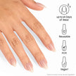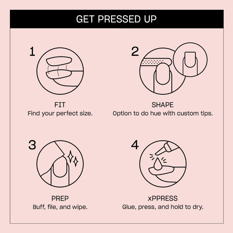Step 1: Cover your natural nail with each nail prosthesis to find the perfect size, making sure to align the number with the tip of your natural nail. Step 2: Create customized shapes and lengths using the Shape Up side of your file. Step 3: Cut or file your nails if necessary and lightly polish their surfaces. Remove dust and debris with the Prep to xPRESS pad, then gently push back cuticles. Step 4: Remove glue cap and gently squeeze bottle. For longer-lasting hold, apply glue to the back of the nail to be pressed and to the natural nail. For short-term use, apply glue only to the nail to be pressed. To remove: Soak your nails in warm water for 10 minutes and apply a small amount of acetone to the base of the nail using a cotton swab. Step 5: Gently lift the nail extensions using your cuticle stick.