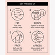 Step 1: Cover your natural nail with each nail prosthesis to find the perfect size, making sure to align the number with the tip of your natural nail. Step 2: Create customized shapes and lengths using the Shape Up side of your file. Step 3: Trim or file your nails if necessary and lightly polish their surfaces. Remove dust and debris with the Prep to xPRESS pad, then gently push back cuticles. Step 4: Remove the glue cap and gently squeeze the bottle. For longer-lasting hold, apply the glue to the back of the nail to be pressed and to the natural nail. For short-term use, apply glue only to the nail to be pressed. To remove: Soak your nails in warm water for 10 minutes and apply a small amount of acetone to the base of the nail using a cotton swab. Then gently lift the nail extensions with your cuticle stick.