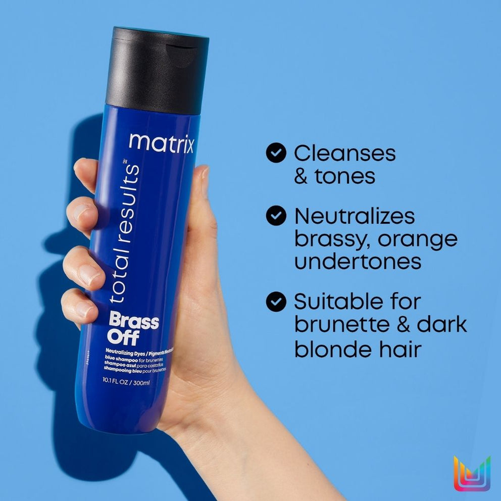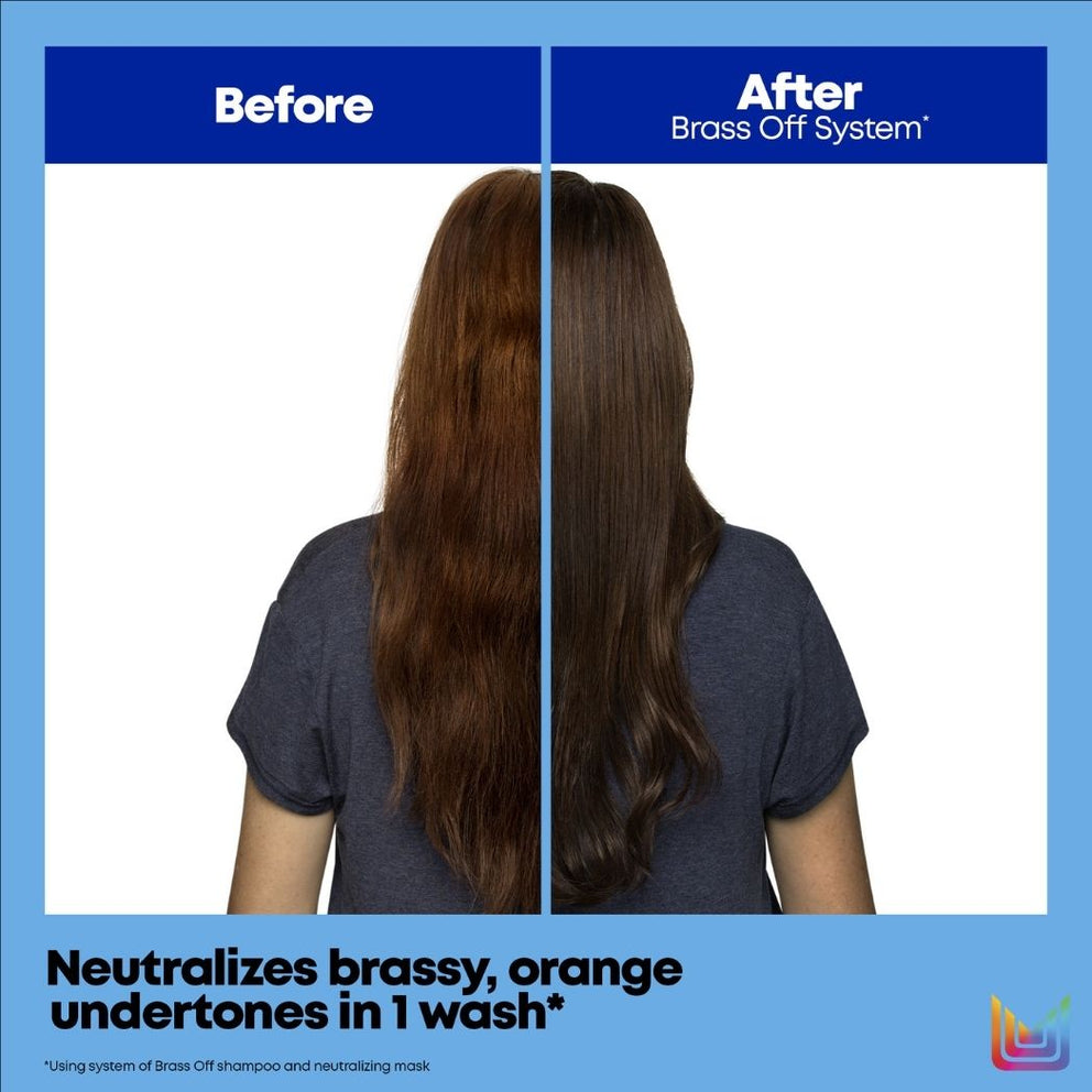 Brass Off Blue shampoo neutralizes brassy tones while refreshing your hair with cool tones. Ideal for brunettes who lighten their hair, it deposits neutralizing blue-violet pigments to reduce brassy tones.
