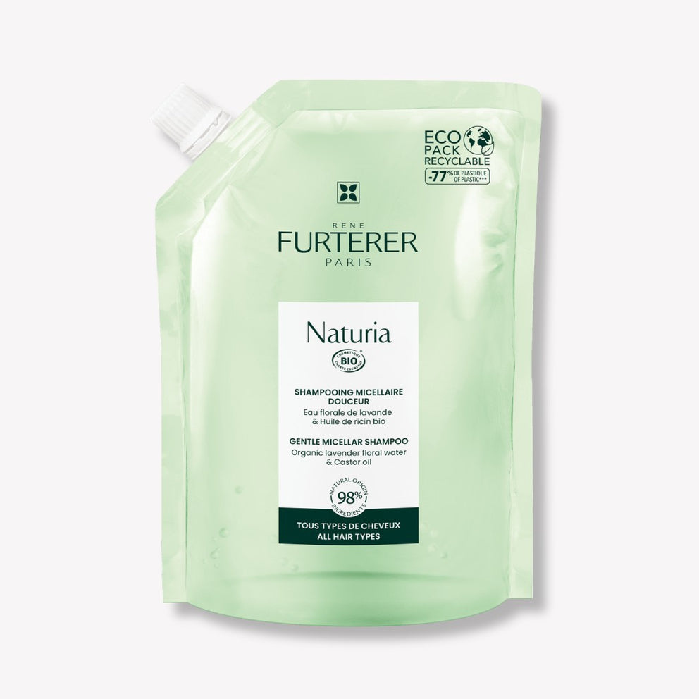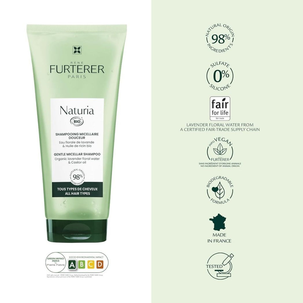 This frequent-use shampoo gently cleanses all hair types, without compromise. Thanks to micellar technology, it effectively eliminates impurities while preserving hair fiber moisture and respecting the scalp. Formulated with precious castor oil and organic lavender floral water grown in France, this delicately scented, certified organic care product has been dermatologically and pediatrically tested. Perfectly clean hair is left soft, supple and light. NATURIA Gentle Micellar Shampoo is suitable for children aged 3 and over, and can be used in conjunction with René Furterer hair care products.