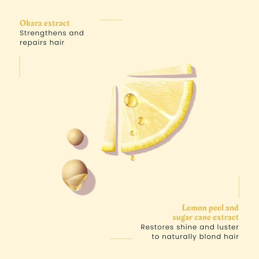 This lightening spray with golden highlights enhances the shine of blond hair, whether natural, highlighted or bleached, while instantly detangling. Formulated with the natural active ingredient RefletLumière, it gradually lightens blond hair by one tone. Enriched with natural Okara extract, it promotes hair repair and protects hair. Its light, non-greasy, no-rinse texture offers practical, effective care for sublimated hair.