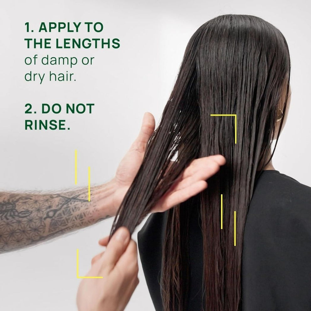 For daily use, apply 1 to 2 dots of product in the palm of your hand, then distribute evenly over lengths, whether towel-dried or dry. Do not rinse.