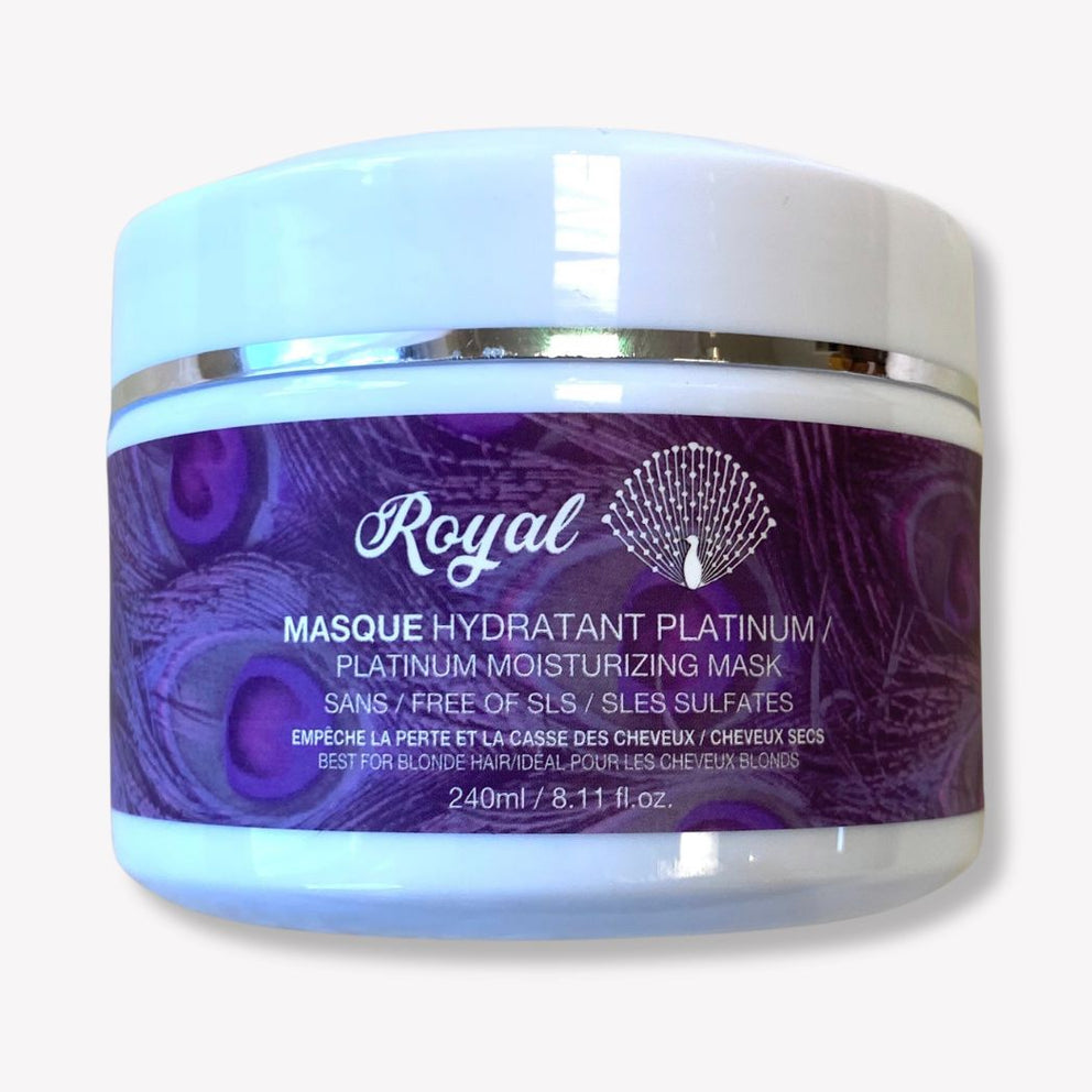 The Royal Platinum Hydrating Mask is specially formulated for blonde, bleached, or highlighted hair. Infused with sweet almond oil rich in vitamins A, B, and E, it provides deep hydration while neutralizing unwanted yellow and brassy tones with its dark blue pigment. This mask restores shine, softness, and manageability while strengthening the hair and helping to prevent breakage. Its creamy texture applies easily, works for all hair types, and rinses clean without residue. Perfect for maintaining a vibrant, luminous blonde, it nourishes, protects, and enhances your hair in one simple step.