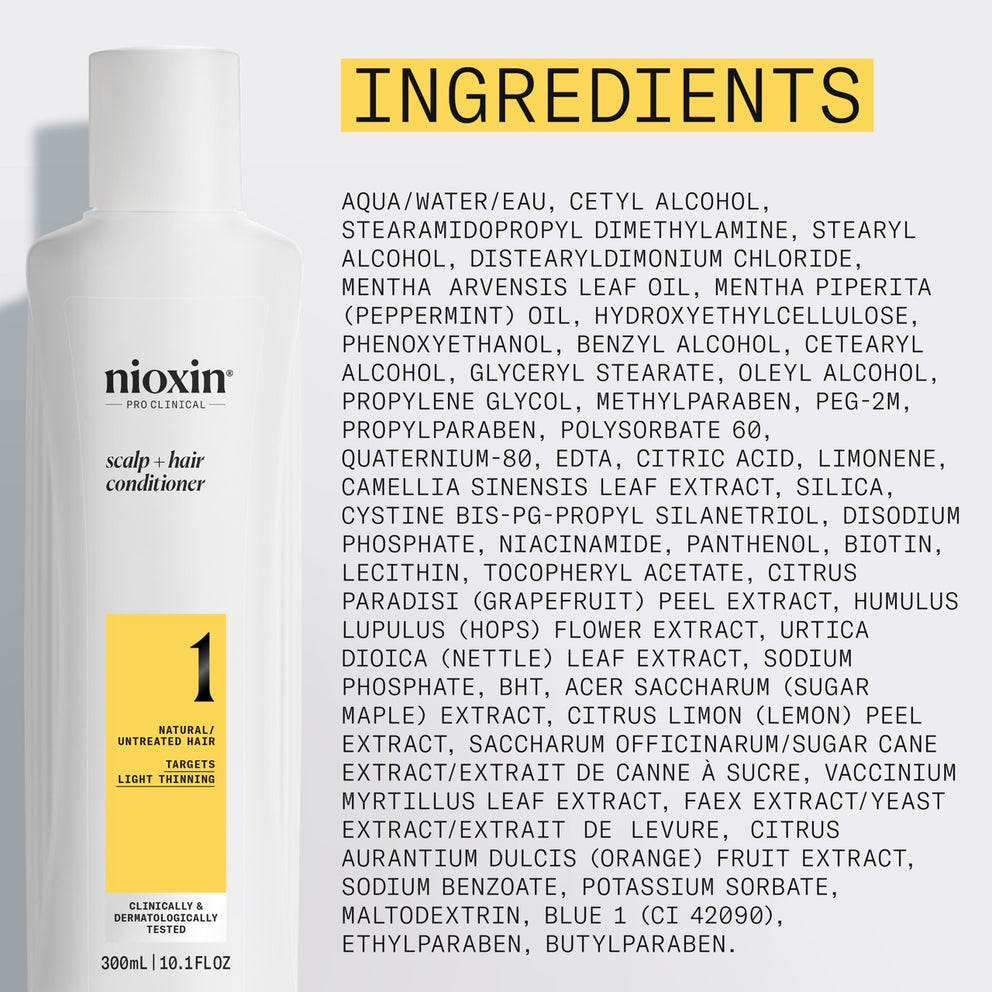 Nioxin Scalp + Hair 1 is a conditioner designed for people with fine or thinning hair. Formulated to lightly moisturize, it aims to strengthen hair strength while promoting healthy growth. Typically composed of antioxidants, vitamins and plant extracts, this product aims to nourish the scalp, remove residues, and maintain an environment conducive to healthy hair.