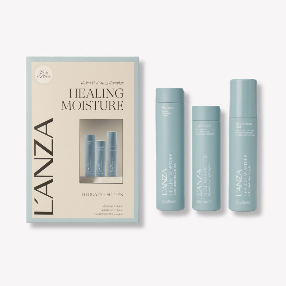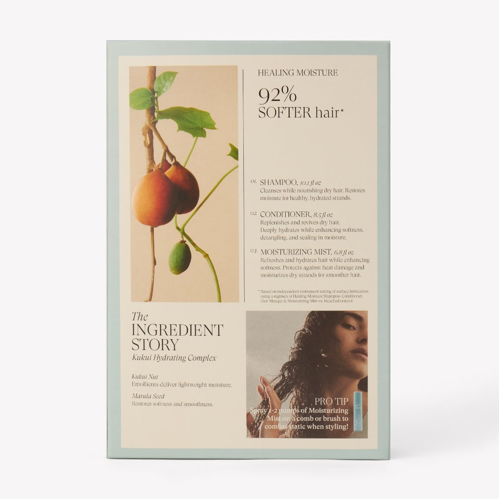 This Healing Moisture trio is designed to quench and revive dry hair with lasting hydration and softness. The shampoo gently cleanses while replenishing moisture, the conditioner deeply nourishes to detangle, smooth, and seal in hydration, and the moisturizing mist refreshes strands, protects against heat, and adds silky softness. Powered by the Kukui Hydrating Complex with kukui nut and marula seed oils, this ritual restores smoothness and transforms hair into healthier, softer, more manageable locks. This set includes: 1 x Healing Moisture Shampoo 300 ml 1 x Healing Moisture Conditioner 250 ml 1 x Healing Moisture Moisturizing Mist 200 ml