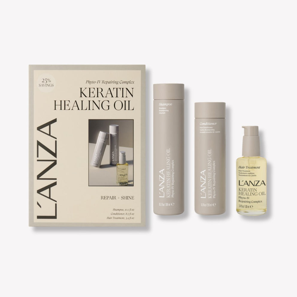 This indulgent 3-step kit delivers the full power of Keratin Healing Oil care for stronger, shinier, and healthier hair. The shampoo gently cleanses while repairing damage and restoring luminous softness, the conditioner detangles and smooths with lightweight hydration, and the treatment oil replenishes elasticity, tames frizz, and protects against heat while enhancing natural shine. Infused with a blend of four wildcrafted botanical oils, this luxurious ritual transforms every strand, leaving hair silky, manageable, and full of vitality. This set includes: 1 x Keratin Healing Oil Shampoo 300 ml 1 x Keratin Healing Oil Conditioner 250 ml 1 x Keratin Healing Oil Treatment 100 ml