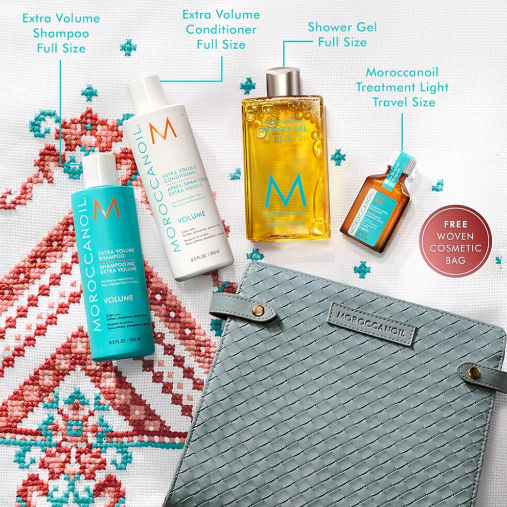 Add lift and fullness to fine hair with the limited-edition Holiday Volume Hair Gift Set. Infused with argan oil and lightweight nutrients, this collection enhances body, shine, and manageability without weighing hair down. Packaged in a complimentary cosmetic bag with a free full-sized Shower Gel, it delivers volume and vitality from head to toe. This set includes: 1 x Volume Shampoo 250 ml 1 x Volume Conditioner 250 ml 1 x Treatment Light 25 ml 1 x Shower Gel 250 ml