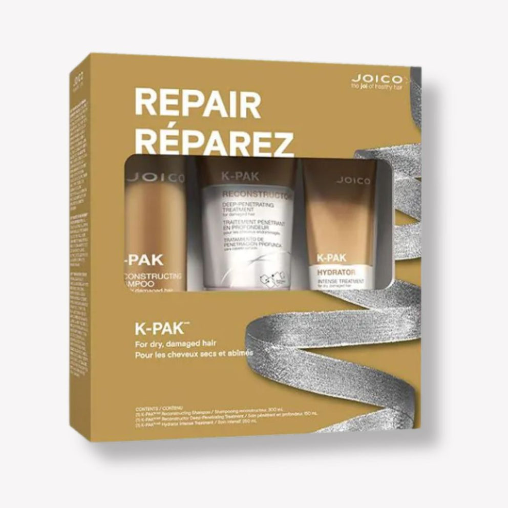 Thanks to Joico's SmartRelease liposome technology, which repairs, strengthens, and protects hair precisely where it needs it most, the iconic K-Pak collection helps repair years of visible damage while fighting future breakage. In just one use, damaged hair is rescued and restored to its former shine and health. This set contains: - 1 x K-Pak Shampoo 300 ml - 1 x K-Pak Reconstructor Treatment 150 ml - 1 x K-Pak Hydrator Treatment 250 ml