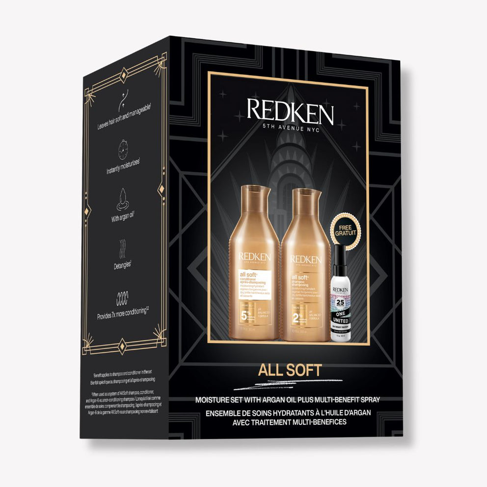 Nourish your hair with Redken's All Soft collection, formulated with argan oil for dry hair, which gently cleanses and softens dry, brittle hair. Set includes: 1 x All Soft Shampoo 300 ml 1 x All Soft Conditioner 300 ml 1 x One United Treatment 150 ml
