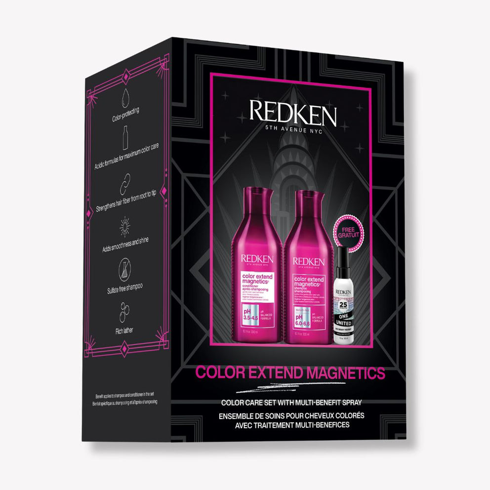 Get longer-lasting color with Redken's Color Extend Magnetics collection that moisturizes, detangles and protects color-treated hair. Set includes: 1 x Color Extend Magnetics Shampoo 300 ml 1 x Color Extend Magnetics Conditioner 300 ml 1 x One United Treatment 150 ml