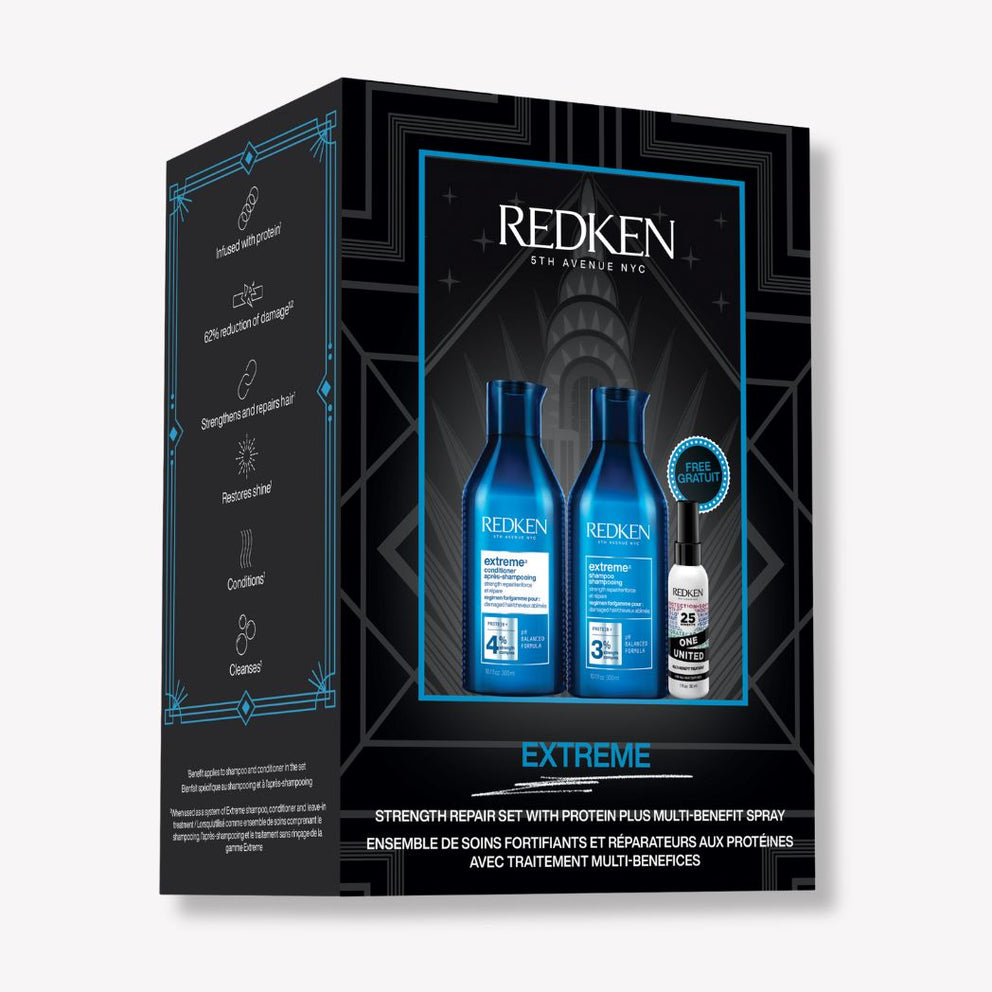 Restore damage and prevent future breakage with Redken's Extreme collection that strengthens and fortifies hair. Set includes: 1 x Extreme Shampoo 300 ml 1 x Extreme Conditioner 300 ml 1 x One United Treatment 150 ml