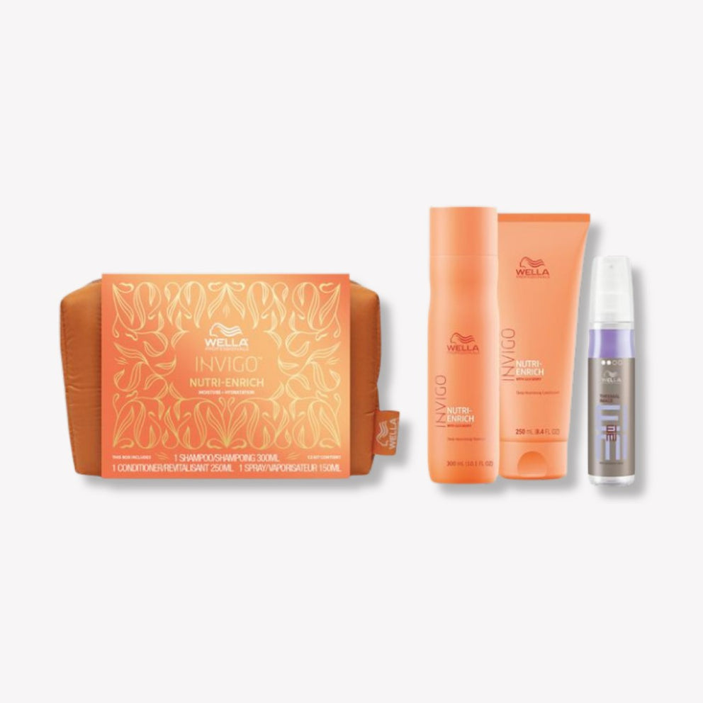 Nutri-Enrich with Nutri-Enrich blend, the range of products for dry hair is created to nourish and smooth dry or damaged hair and restore vitality. This set includes: - 1 x Invigo Nutri-Enrich Shampoo 300 ml - 1 x Invigo Nutri-Enrich Conditioner 250 ml - 1 x Thermal Image Heat Protection Spray 150 ml