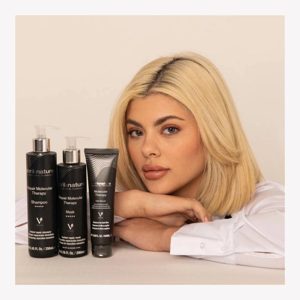 The Molecular Therapy Shampoo by Abril et Nature delivers instant repair and deep hydration for extremely damaged or weakened hair caused by chemical treatments. Enriched with hyaluronic acid, plant stem cell extract, and the innovative Molecular-D Bond Restore complex, it penetrates deep into the hair fiber to strengthen and rebuild it from within. Thanks to its advanced molecular repair technology, this shampoo restores broken keratin bonds, revitalizes the hair structure, and seals the cuticle for a radiant, long-lasting shine. Perfect for dry, brittle, dull, or aged hair, it leaves the hair silky, smooth, and visibly healthier after each wash. Result: deeply repaired, stronger, and shinier hair — with renewed vitality from root to tip.