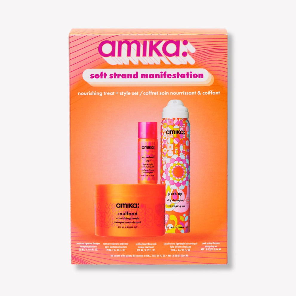 The Soft Strand Manifestation set is a complete ritual for softer, stronger, and healthier-looking hair. Featuring the full-size Soulfood Nourishing Mask, it deeply conditions and restores vitality, while travel-size essentials like Perk Up Dry Shampoo and Superfruit Star Lightweight Hair Oil keep strands refreshed, smooth, and protected on the go. Paired with sample sizes of Normcore Signature Shampoo and Conditioner, this exclusive set delivers total strand care—hydration, strength, shine, and style—all in one.