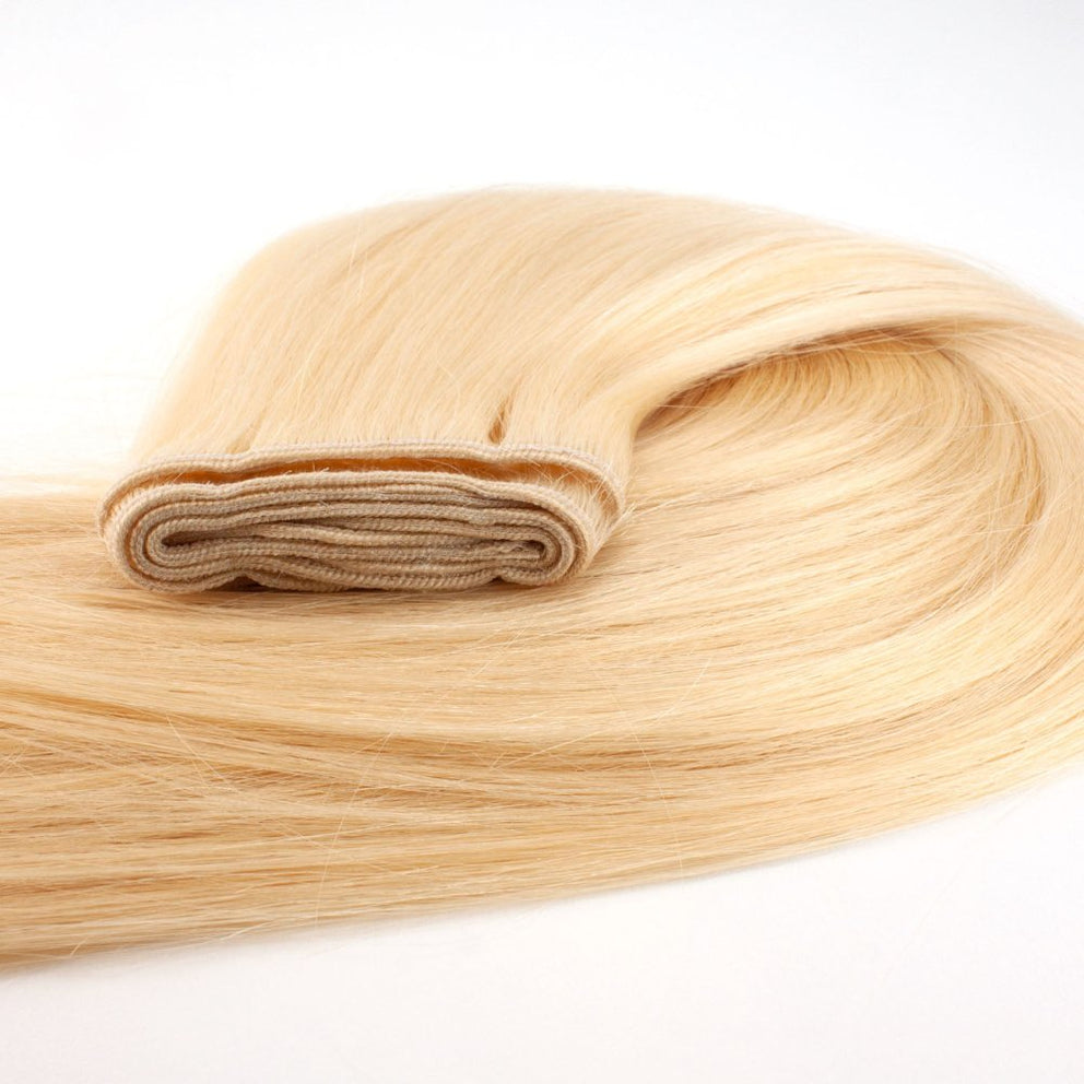This band of hair can be sewn, braided, glued or put down with clips. It’s possible to cut the band to obtain exactly the desired width. It’s even possible to cut fine wicks to install them with keratin miter or stick.