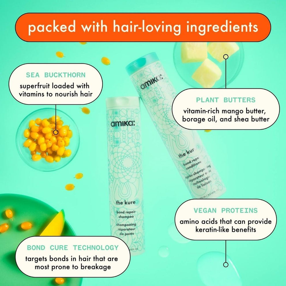 Amika's The Kure repairing shampoo repairs, restores and revitalizes dry, damaged hair stressed by daily aggressions, heating appliances and chemical treatments.