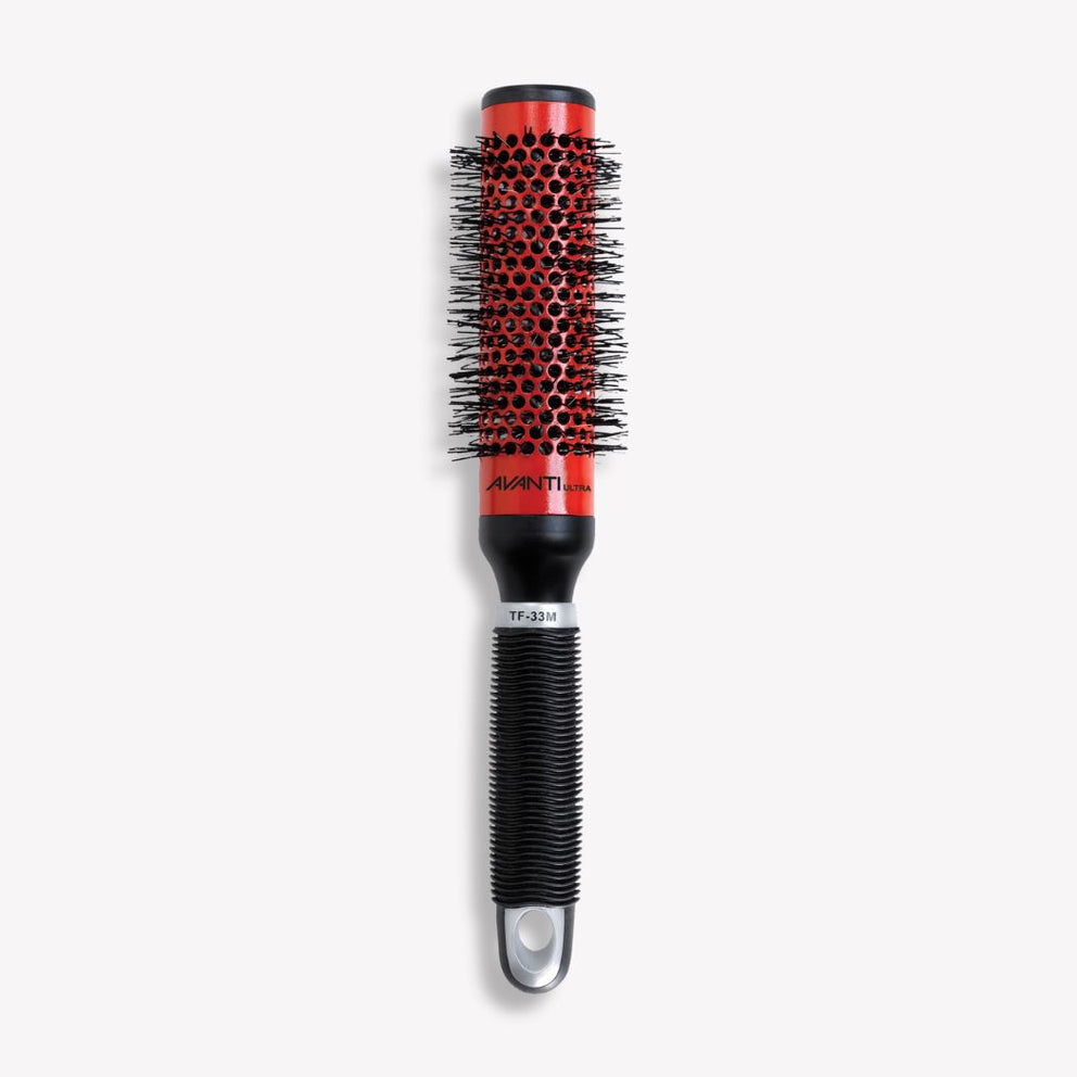 Small thermal brush with tourmaline and ceramic Circular thermal brush - 25mm tube Firm nylon bristles containing tourmaline Ceramic tube with large orifices Shaped rubberized black handle ergonomic Light and balanced Available in 3 other formats: MEDIUM (TF-33MC), LARGE (TF-43LC) and GIANT (TF-53XLC) Ceramic and tourmaline, natural sources of negative ions and far infrared heat, prevent the formation of electrostatic charges and eliminate unwanted frizz, leaving hair shiny and healthy The ceramic tube effectively distributes and retains heat, providing faster styling. The infrared heat, which is produced during drying, is gentle on the hair Lightweight and ergonomically shaped, it is perfect for prolonged use The holes in the tube allow air circulation, which makes drying more efficient The nylon bristles provide good tension on the hair, allowing you to control the densest and messiest hair The very comfortable rubberized handle provides total control, a solid grip and a unparalleled comfort during styling