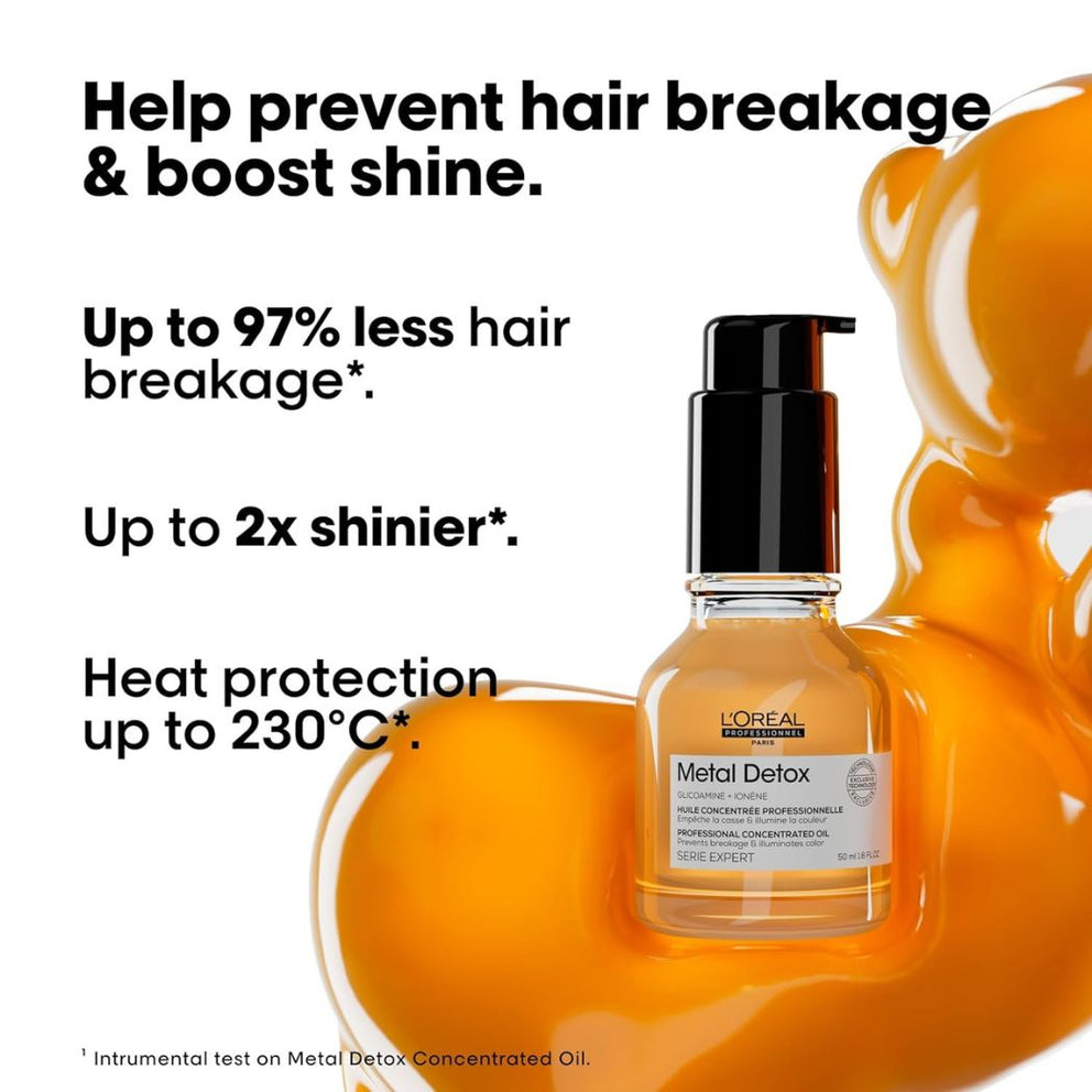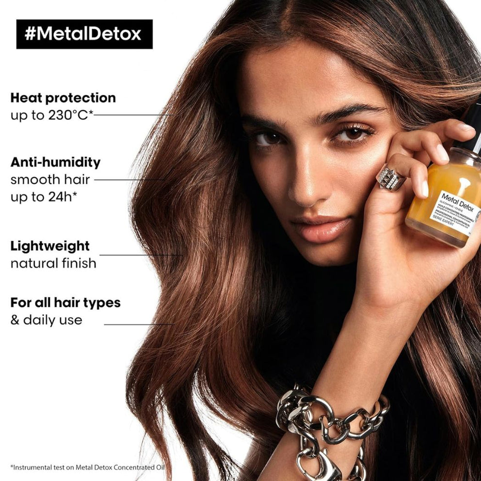 Wash after wash, excess metal penetrates the hair. Metal particles create a risk of breakage and color change. Enriched with Glicoamine, Metal Detox Oil protects hair from the deposit of metal particles. Its concentrated formula offers up to 97% less breakage and makes hair 2x shinier, for stronger, more nourished hair with more body and discipline. Its rich-textured, professional formula is instantly absorbed by the hair fiber without weighing it down, for a light, bouncy, natural finish. It also offers protection against the effects of humidity and thermal protection up to 230°C/450°F, for hair that stays smooth for up to 24 hours.
