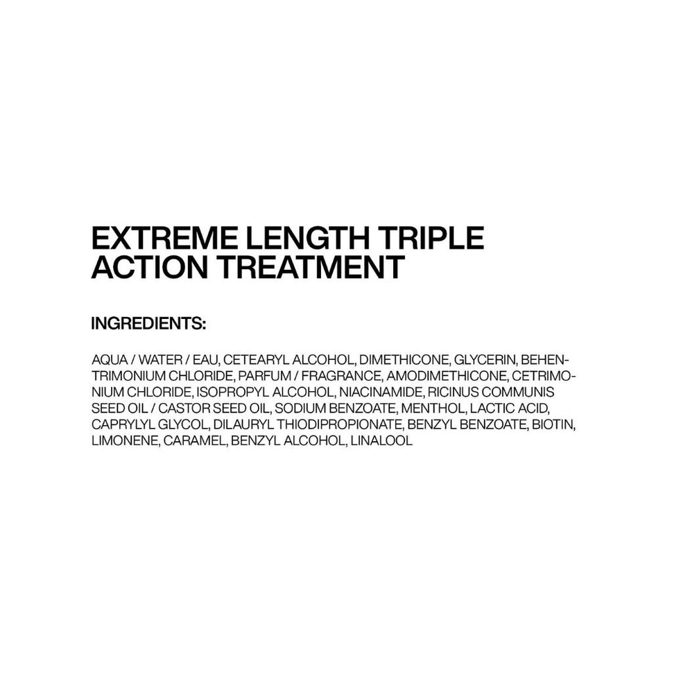 The Triple Action Extreme Length Treatment is a powerful 5-minute mask formulated with niacinamide, biotin, and castor oil to strengthen the scalp, nourish the lengths, and visibly reduce split ends. This strengthening treatment makes hair longer and more resistant, while giving it a healthy appearance without weighing it down. It effectively targets breakage for hair that is twice as strong after the first use and reduces split ends by 68%.