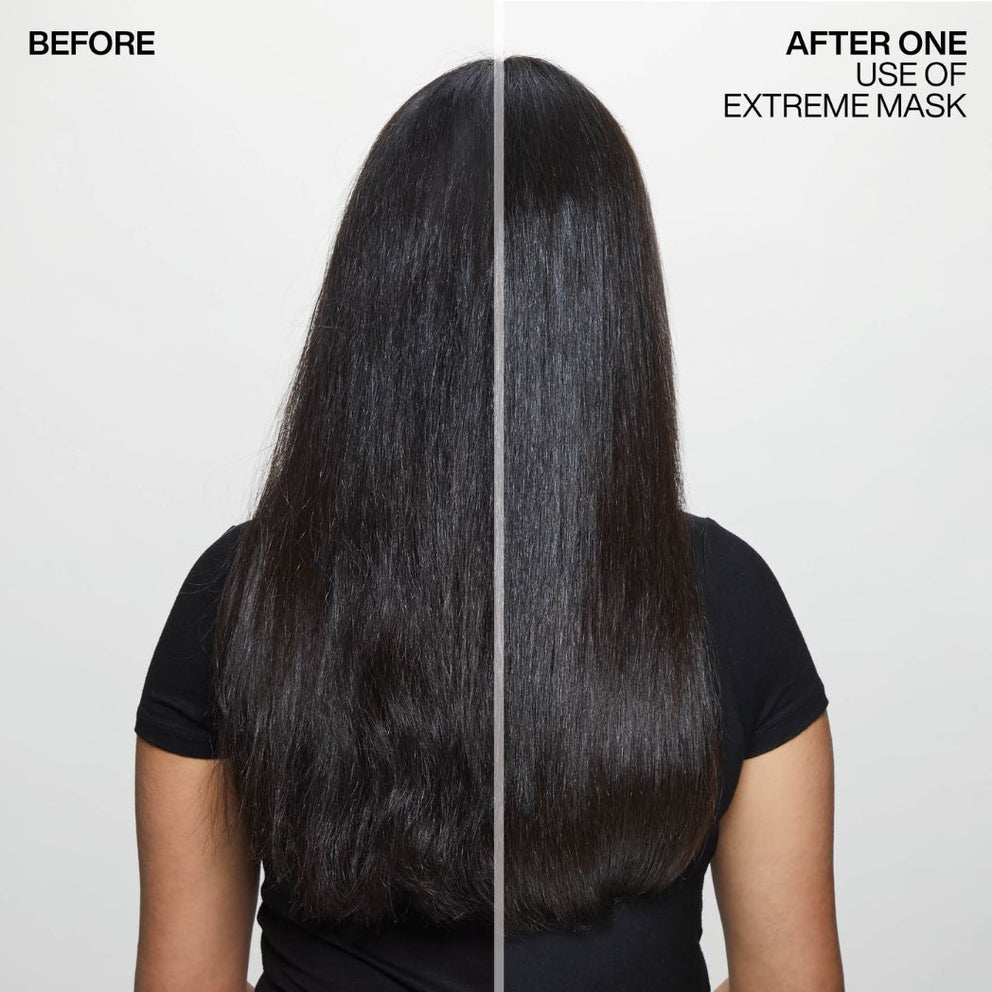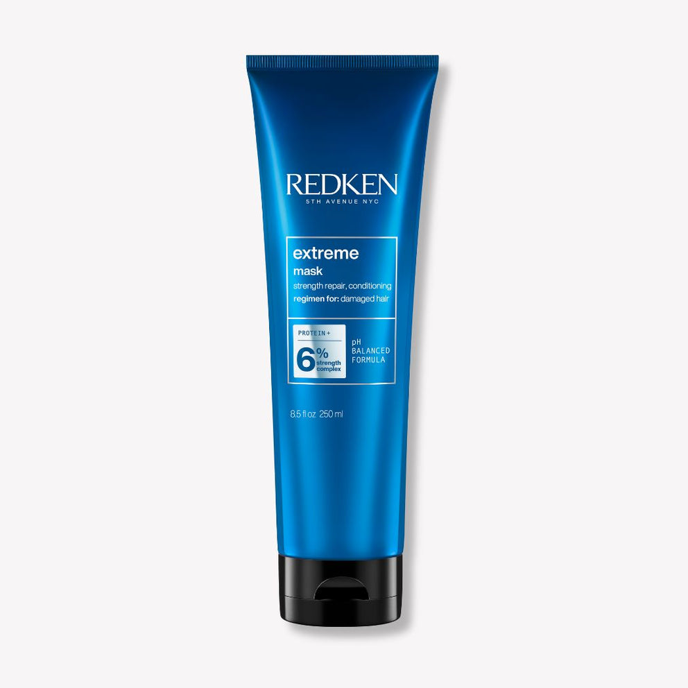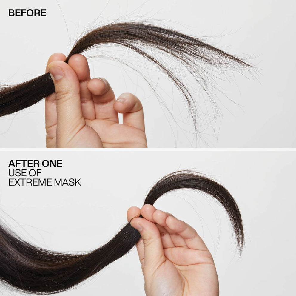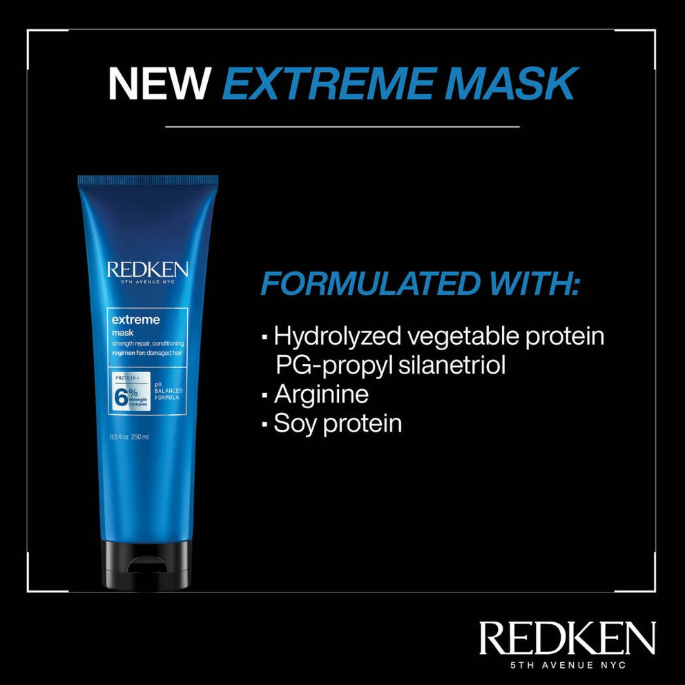 Extreme Mask is a rinse-off treatment for dry, damaged hair. This deep treatment fortifies damaged hair to make it 15 times stronger, and is formulated with Redken's Strength Complex containing proteins and lactic acid to help restore strength, balance pH levels and add softness.