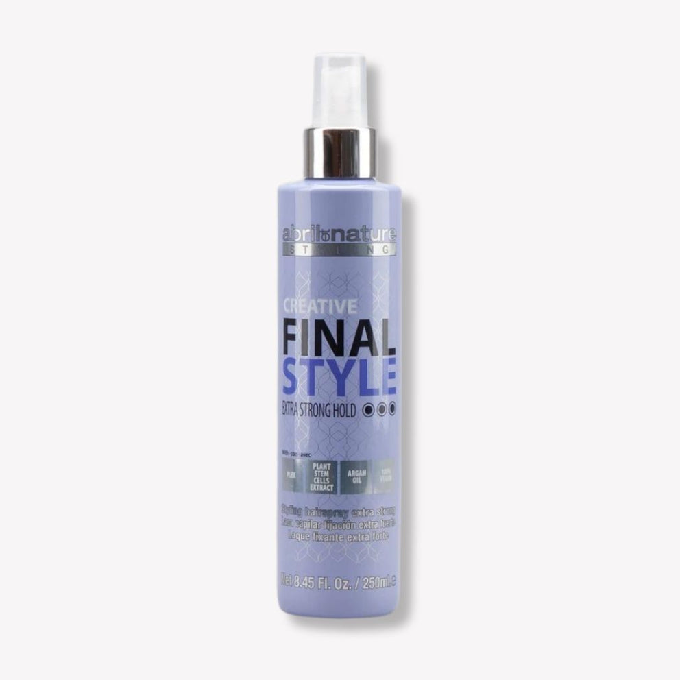 Découvrez le fixatif non-aérosol Final Style Extra Firm Hold d’Abril et Nature, une fixation ultra-forte pour un contrôle total de votre coiffure, sans effet collant ni résidus. Sa formule professionnelle offre une tenue longue durée même en conditions humides, tout en protégeant la fibre capillaire. Enrichie en huile d’argan, en complexe Plex-Cystine et en extraits de cellules souches végétales, cette laque combine force, protection thermique et brillance. Elle reconstruit les liaisons internes de la kératine, renforce la fibre capillaire et prévient la casse. Sa brume légère forme un film de fixation flexible et un effet mémoire, permettant de remodeler la coiffure après application. Idéale pour les coiffages techniques au fer ou au lisseur, elle laisse les cheveux souples, lumineux et protégés. Résultat : une coiffure sculptée, brillante et résistante du matin jusqu’au soir.