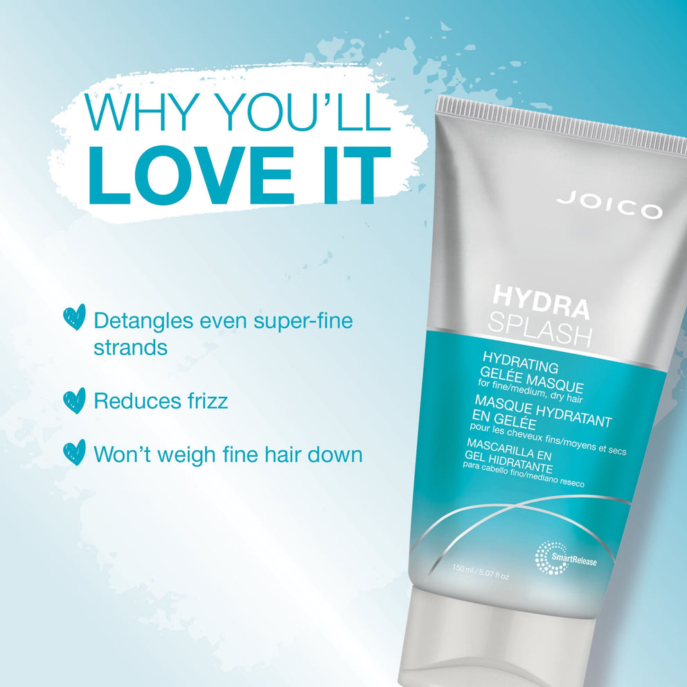 Le masque hydratant en gelée HydraSplash offre une hydratation intense pendant 24 heures sans alourdir les cheveux fins à moyens. Dès la première utilisation, il laisse les cheveux ressourcés, brillants et en pleine santé, apportant une dose de fraîcheur et de légèreté aux cheveux secs et déshydratés.